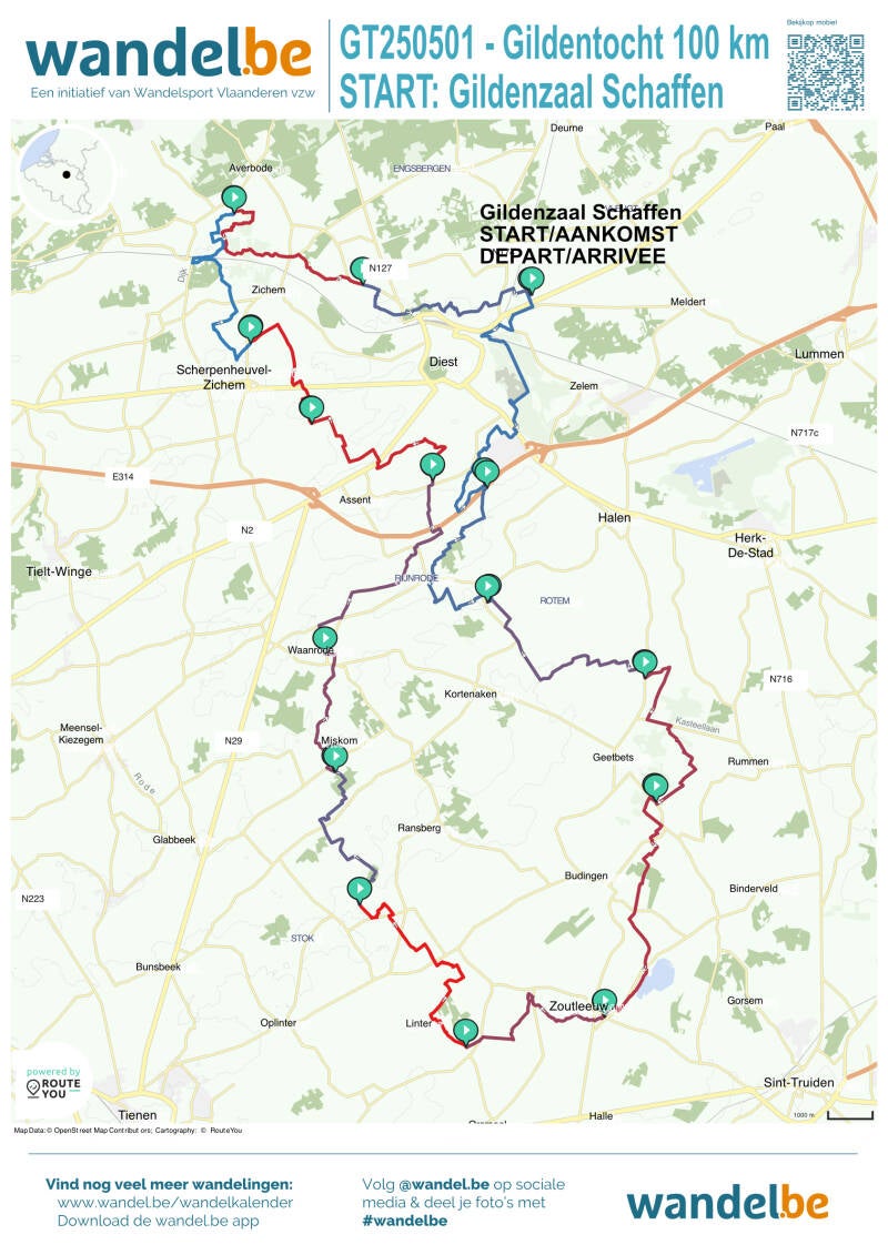 Onze Vijftiende Gildentocht neemt ons mee naar Haspengouw ter hoogte van Zoutleeuw en het Hageland. We starten ons avontuur in het Webbekoms broek. De avond valt, de natuur komt hier tot rust, de wegen zijn makkelijk begaanbaar. Wanneer we de fruitgaarden van Haspengouw in Halen betreden, verandert ook het landschap en de begaanbare wegen. De vele onverharde wegen, voorzien van klei, maken onze tocht ook deze keer zwaar. De overstromingsgebieden van waterlopen zoals de Gete, openen nieuwe, prachtige ongeziene vergezichten. Maar wat zullen de regengoden ons begin mei geven?... We overwinnen 600 hoogtemeters over een parcours dat voor meer dan 70% onverhard is. We beklimmen de heuvelruggen van het Hageland tijdens de eerste en laatste 20 kilometer. Je wordt ondersteund door 13 controleposten, waar er voldoende eten en drinken voorradig is. De eerste 51km worden in groep gewandeld. Er is twee maal toegang tot de bagage (op 43 km. in Melkwezer en op 63 km. in Waanrode).