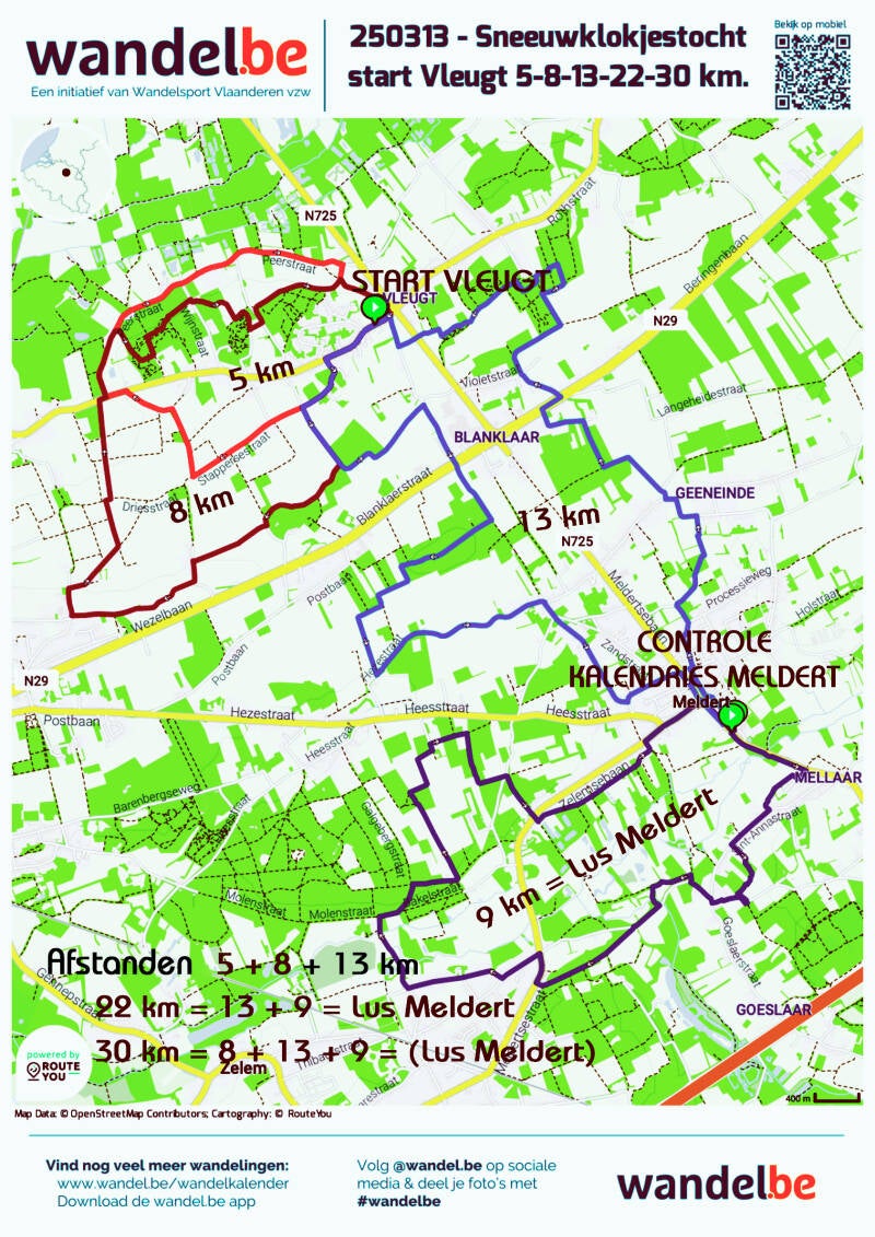We starten met alle afstanden vanuit zaal De Vleugt, langs de Vleugtstraat, om linksaf te slaan in de Stappersestraat langs het kappelletje van Ziekenzorg. We buigen rechtsaf langs het zonnepanelenveld en langs de Peerstraat maken we een ruime bocht rond de Schellekensberg. Over verharde wegen lopen we terug naar de startzaal.